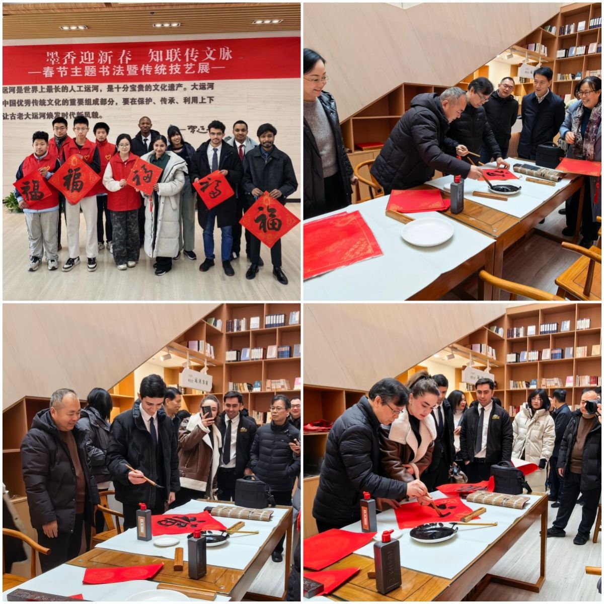 为传承中华优秀传统文化,凝聚党外知识分子力量,1月24日上午,济宁市党外知识分子联谊会与我校党外知识分子联谊会等单位共同在济宁市河道总督府举办“墨香迎新春 知联传文脉”春节主题书法暨传统技艺展。我校党委委员、统战部部长张永强出席活动,校知联会会长苑壮东、副会长肖桂花,美术学院党委书记杨晓青、音乐学院副院长杨昉,以及20余名知联会会员代表、12名留学生代表参加活动。